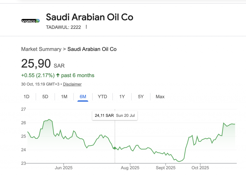 For investors, Aramco’s chart reflects a combination of stability and global relevance. As the world’s leading crude exporter, the company’s financial resilience has attracted institutional and retail investors alike, making it one of the most valuable publicly traded entities worldwide.